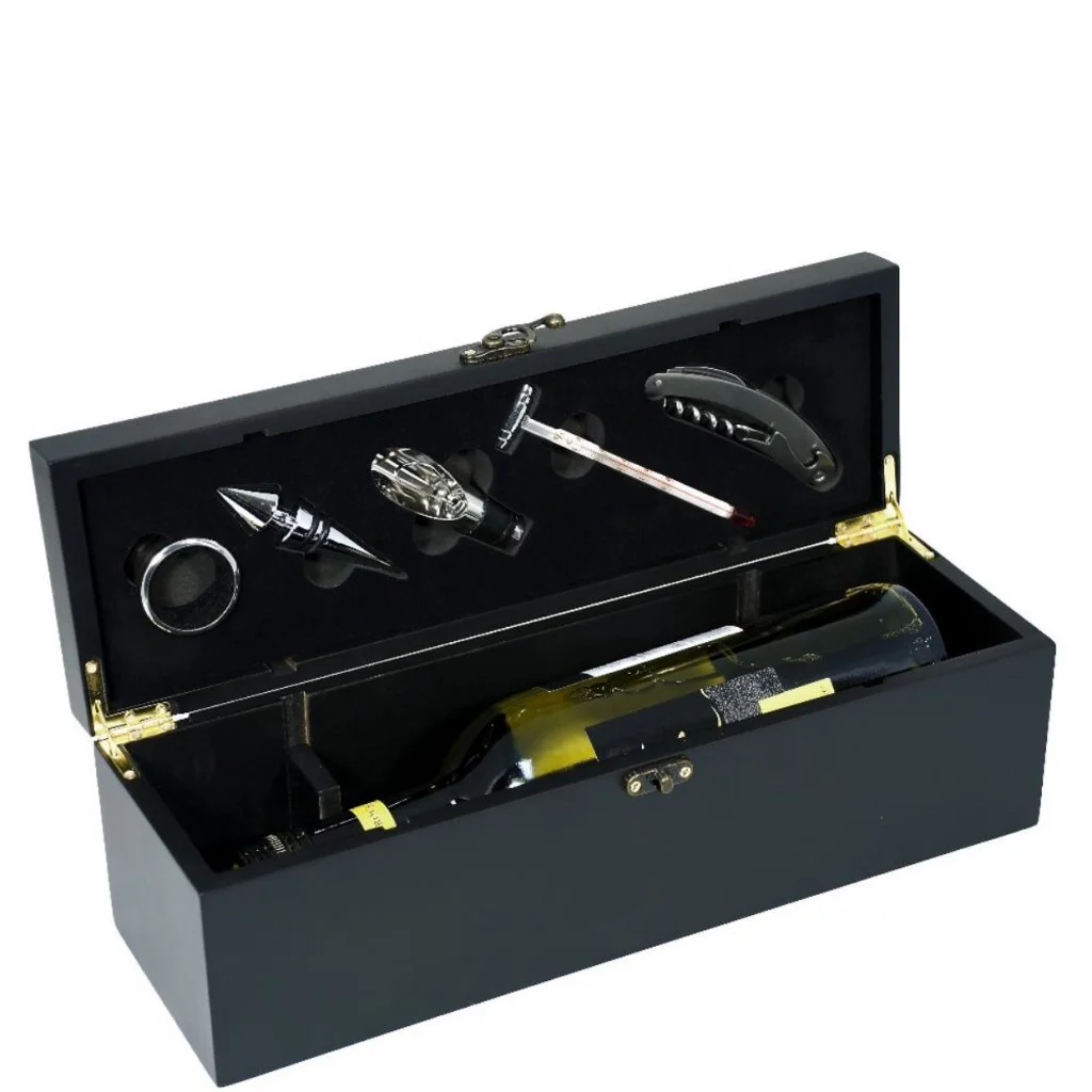 Ett riktigt stiligt vinset med 5 st vintillbehör. Lådan är tillverkad i svart trä och har även utrymme för en normalstor vinflaska. Perfekt till vinprovningen eller festen! De fem tillbehören är; 1 st vinöppnare, 1 st vinstopper, 1 st hällpip, 1 st vintermometer och en droppring.