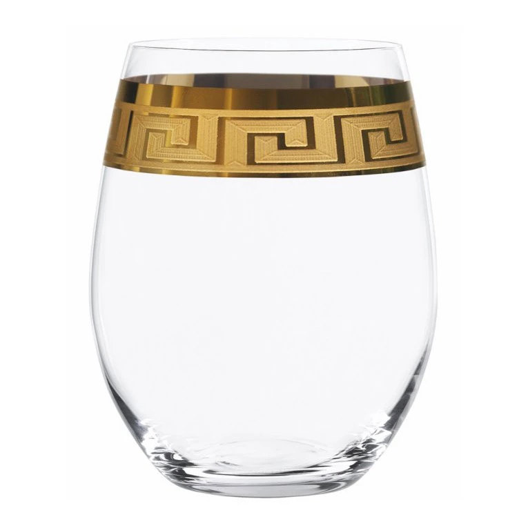 Denna läckra tumbler har ett band med grekiska nycklar i guld upptill. Muse Tumbler är ett perfekt matchande vattenglas till den övriga serien men står även själv ut som ett exklusivt vinglas utan stjälk till både röda och vita viner. Guldbandet upptill bidrar med en flärdfull nyans utan att ta för mycket plats som helhet.