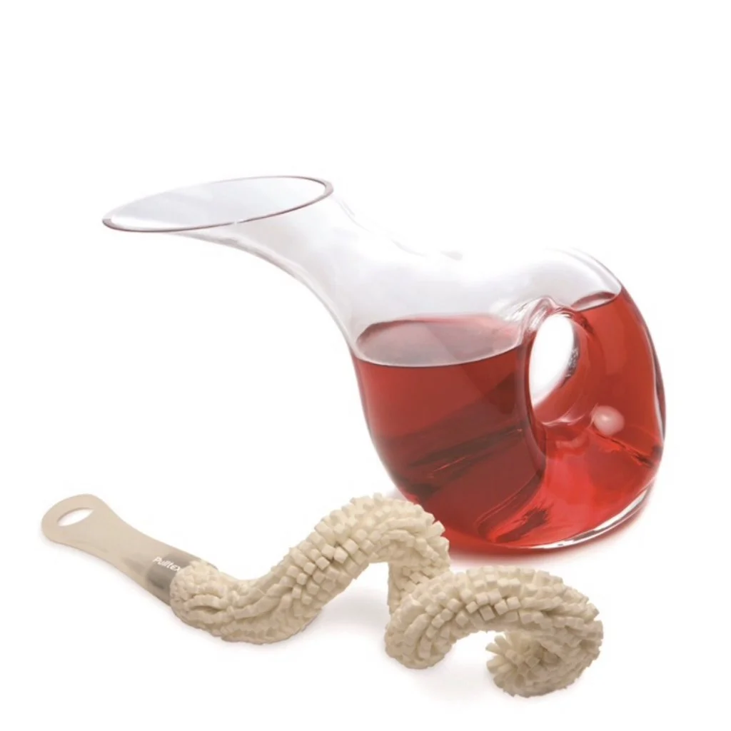 En läcker vinkaraff med tillhörande karaffborste från Pulltex. Afrodita Vinkaraff har en unik design med en hålighet i mitten som agerar som handtag. Stilig liggande karaff med en smal hals för att underläta vid servering. Den praktiska karaffdiskborsten är ergonomiskt utformad och kommer med lätthet åt i alla vrår i karaffen men går naturligtvis utmärkt att använda även till andra karaffer och vinglas.