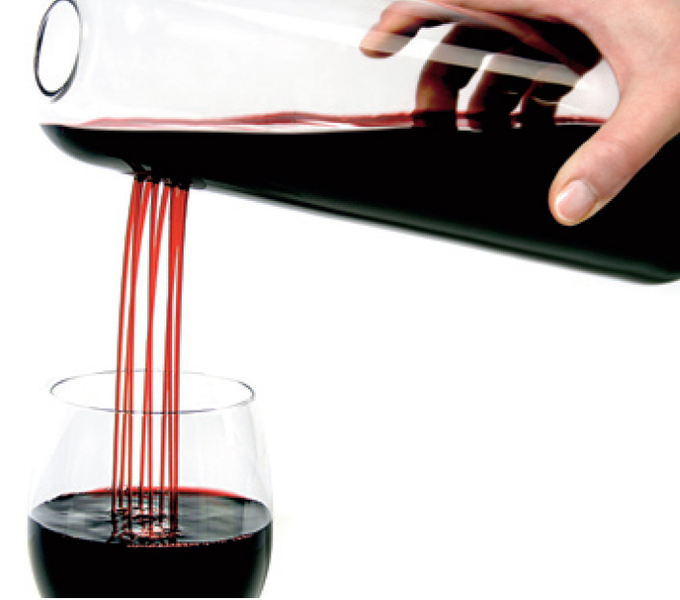 Vinkaraff RainMan från Skruf har en design som är helt unik och som förhöjer serveringen av innehållet där ett flertal enskilda strålar fyller på innehållet i glaset.